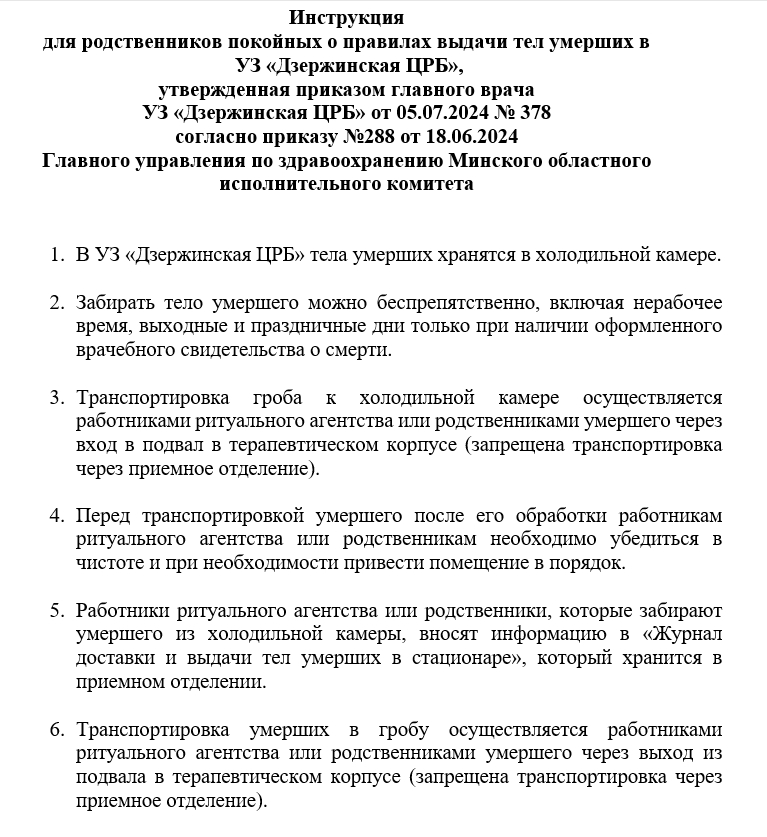 Инструкция для родственников покойных о правилах выдачи тел умерших в УЗ «Дзержинская ЦРБ»