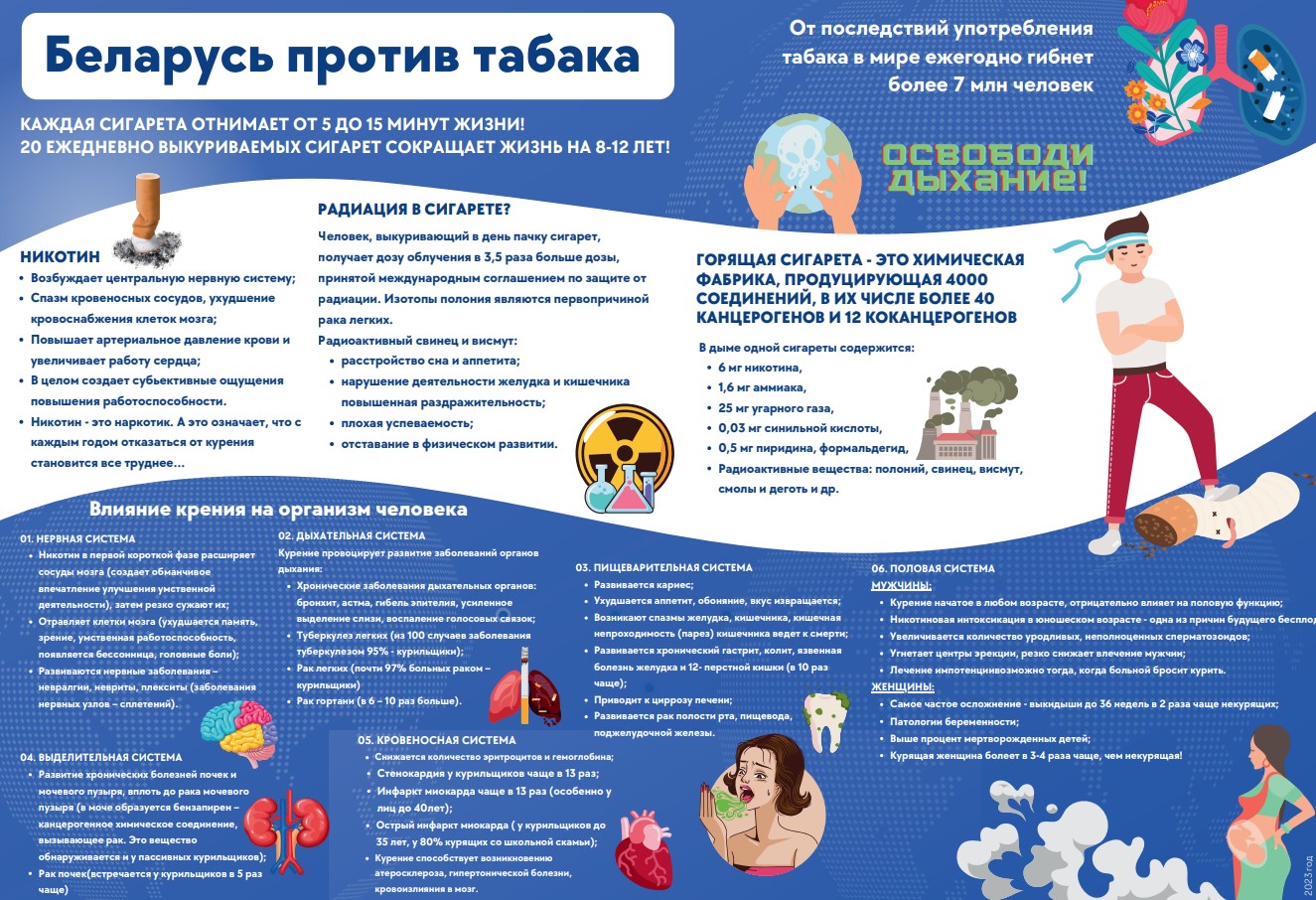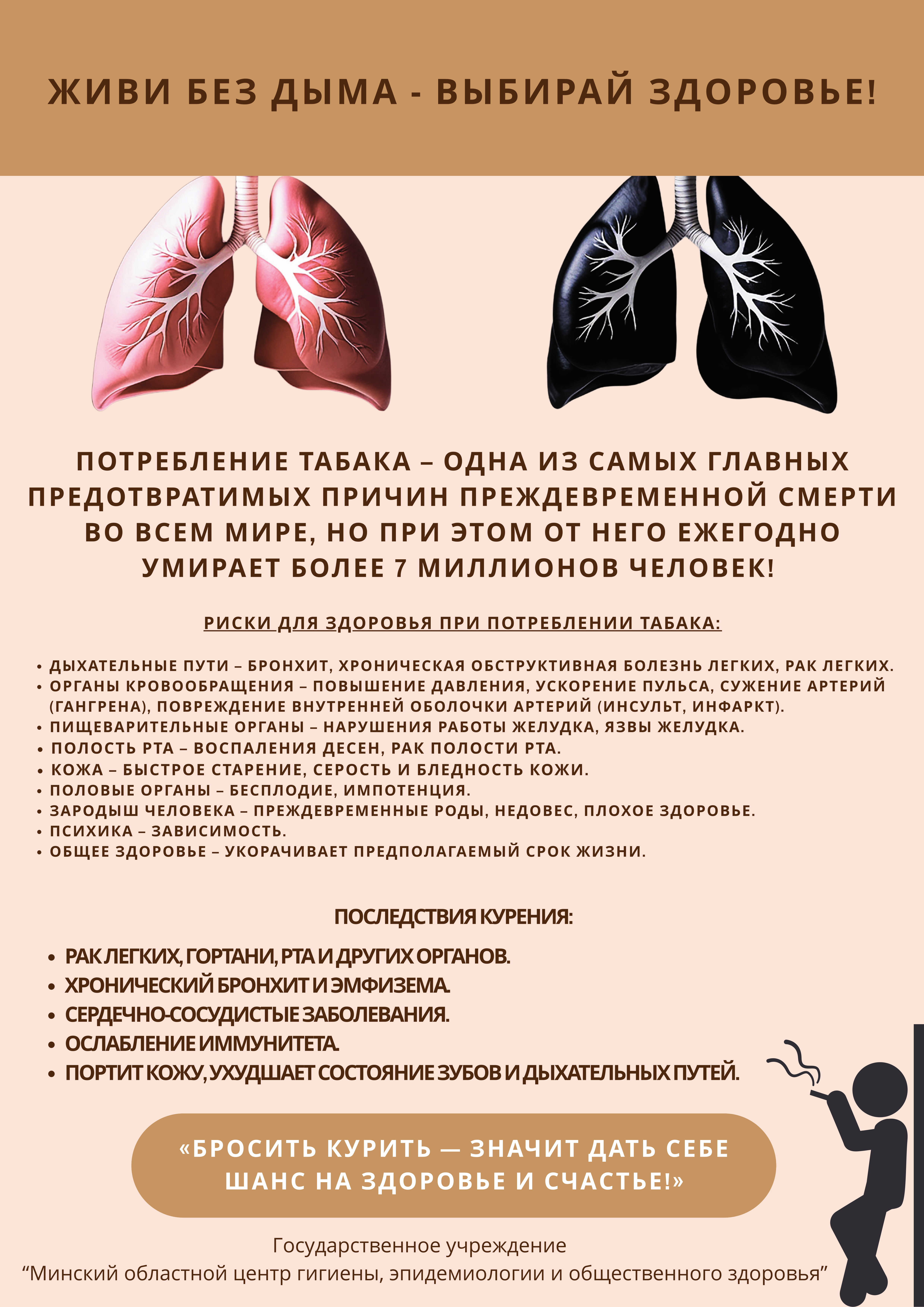 На основании приказа Министерства здравоохранения Республики Беларусь от 28.12.2000г. №603-А «О запрещении курения в учреждениях здравоохранения», приказа Министерства здравоохранения Республики Беларусь от 01.07.2011г. №710 «Об утверждении инструкции о порядке осуществления действенного контроля за соблюдением запрета курения в организациях здравоохранения и на прилегающих к ним территориях и Примерного положения комиссии по контролю за запретом курения в организации здравоохранения», в целях организации Директивы Президента Республики Беларусь от 11.03.2004 №1 «О мерах по укреплению общественной безопасности и дисциплины», профилактики заболеваний, причинно связанных с табакокурением, а также активизации работы по пропаганде здорового образа жизни населения, на территории УЗ «Дзержинская ЦРБ» курение запрещено!